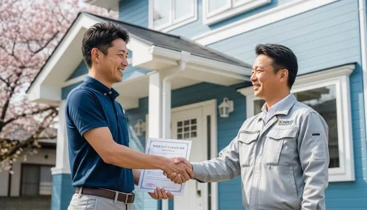 工事完了後、綺麗になった家の前で施主と業者が保証書を手に笑顔で握手している