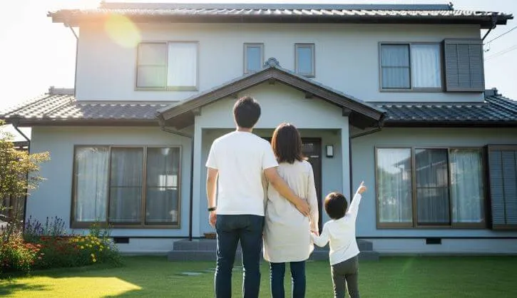 外壁塗装が完了した美しい家を、後ろから幸せそうに眺める日本人親子3人のリアルな写真。家族の喜びと満足感を表現している