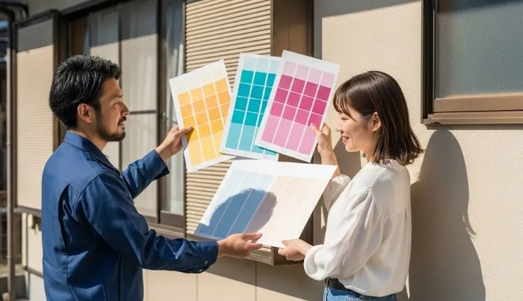 小さな色見本帳だけで色を決めるのは、失敗の元です。色は面積が大きくなるほど明るく、鮮やかに見える傾向があります(これを面積効果と呼びます)。候補の色を2〜3色に絞ったら、必ず業者に依頼してA4サイズ以上の大きな板に実際に塗装してもらいましょう。それを屋外の自然光の下で、時間帯を変えながら(朝・昼・夕)、実際の外壁にあてて確認することが、イメージとのズレを防ぐ最も確実な方法です。 - 鉄則2:「カラーシミュレーション」で全体の調和を見る