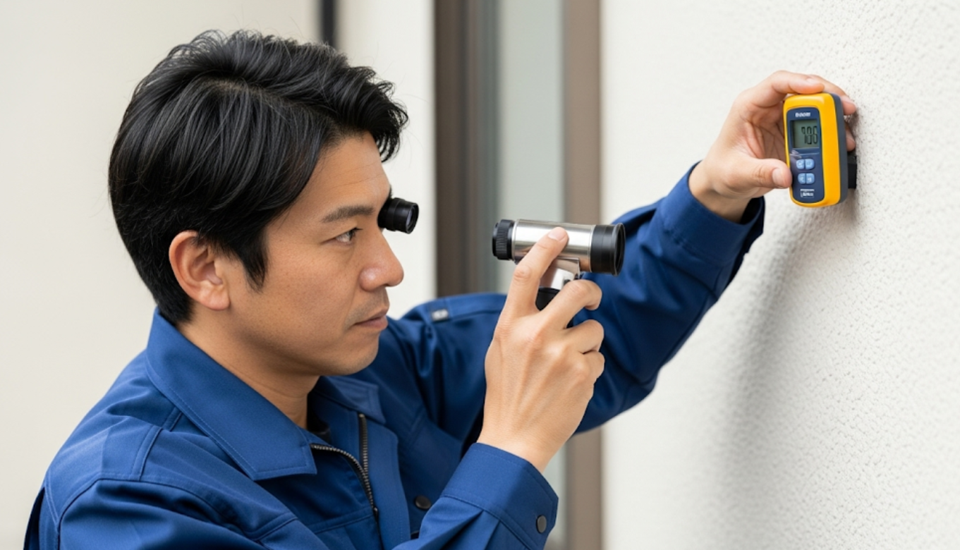 アップリメイクの専門家が、専用機材で外壁の劣化を診断している様子。