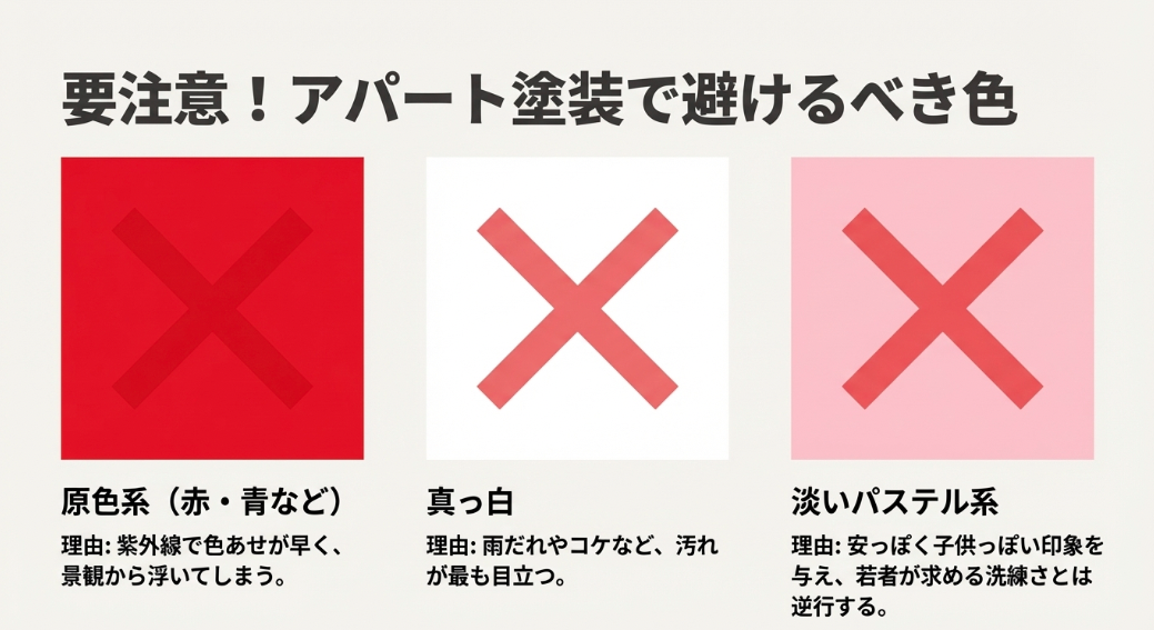 アパート塗装で避けるべき色(原色、真っ白、パステル)の注意喚起