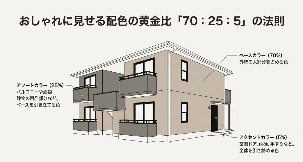 外壁塗装でおしゃれに見せる配色の黄金比70:25:5の法則図解