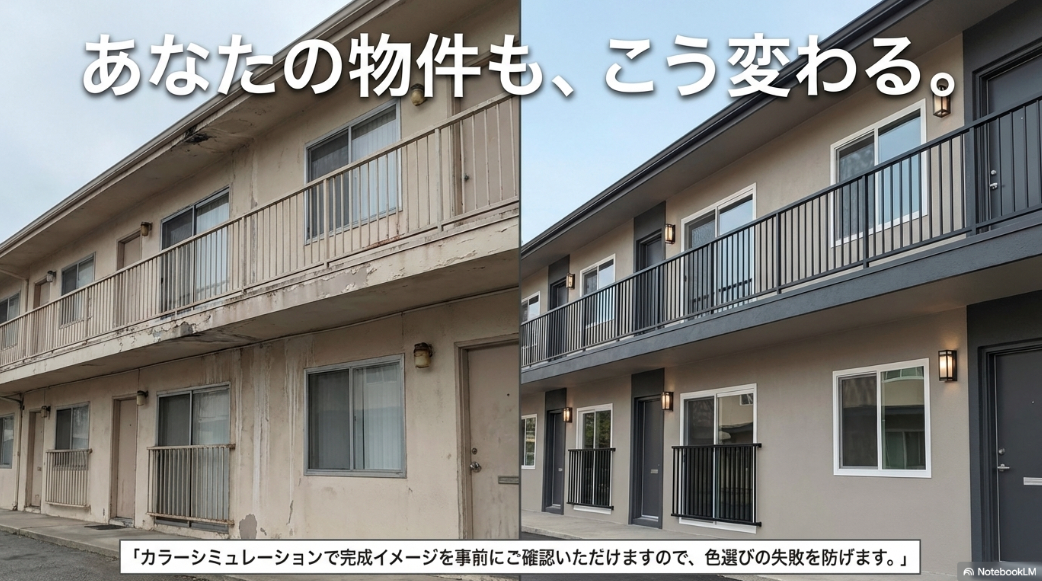 • 空室対策効果:外観の印象を入居者ターゲットに合わせて刷新することで、内見数や入居率の向上が期待できる。