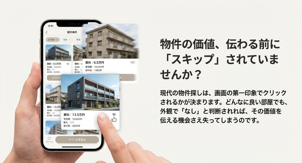 入居希望者は、無数に並ぶ物件リストの中から、家賃や間取りなどの条件に加え、「外観写真」の第一印象でクリックするかどうかを瞬時に判断しています。
