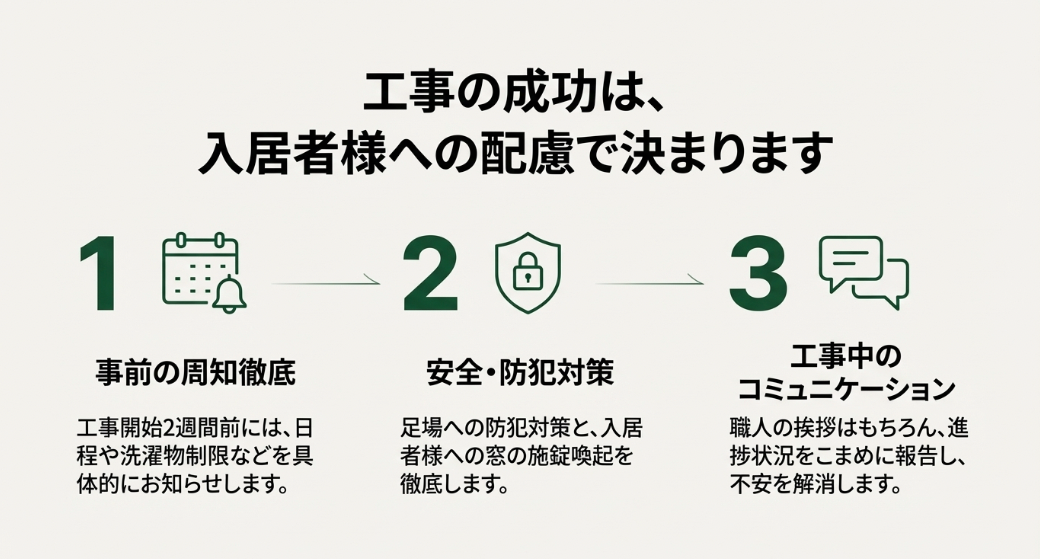 施工前に必ず押さえておくべき最大の注意点は、「入居者様への配慮と周知徹底」です。