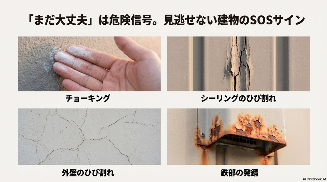 オーナー様が「まだ大丈夫だろう」と思っていても、チョーキング(壁を触ると白い粉がつく現象)や微細なひび割れが見られた時点で、建物の防水機能はすでに低下しています。