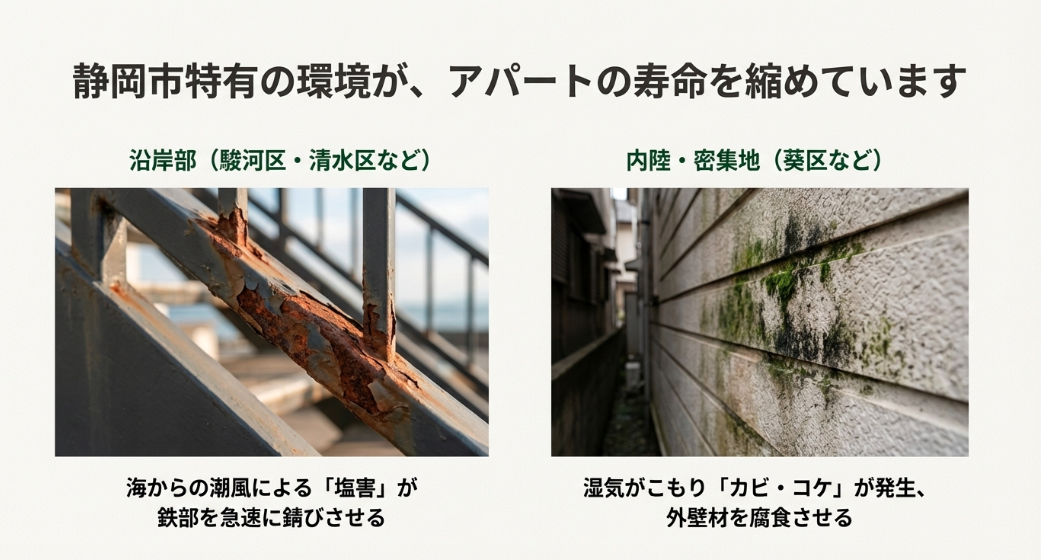 例えば、駿河区や清水区の沿岸部では、海からの潮風による「塩害」の影響を強く受けます。