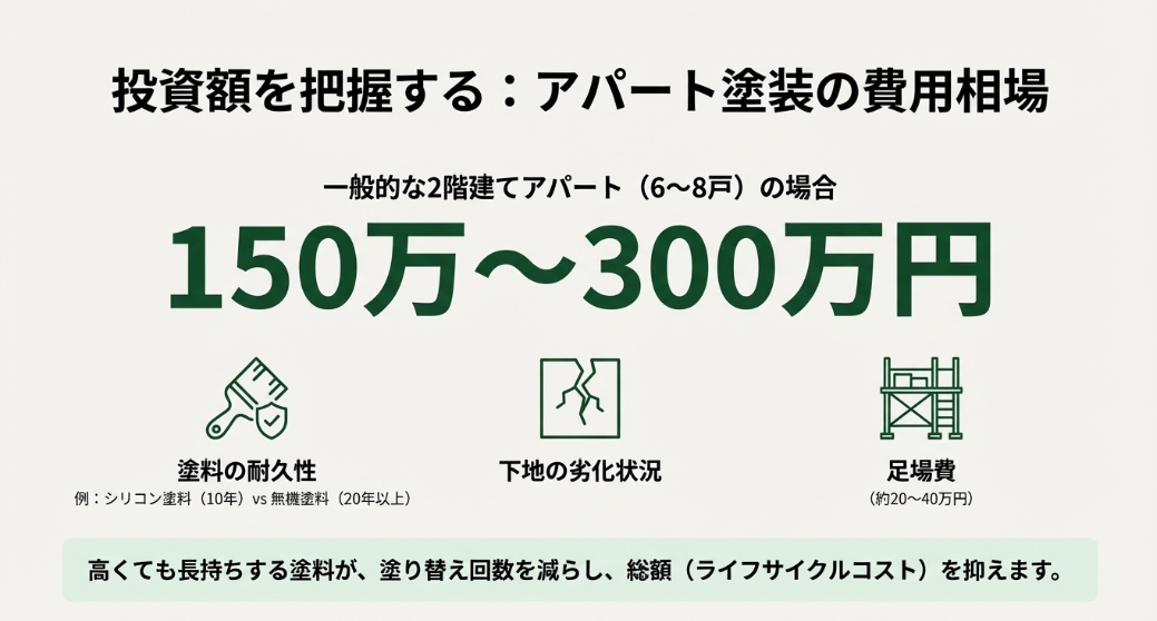 あくまで目安とはなりますが、一般的な2階建てアパート(延床面積約50坪〜80坪、6戸〜8戸程度)の場合、およそ150万円〜300万円程度が適正な価格帯となります。
