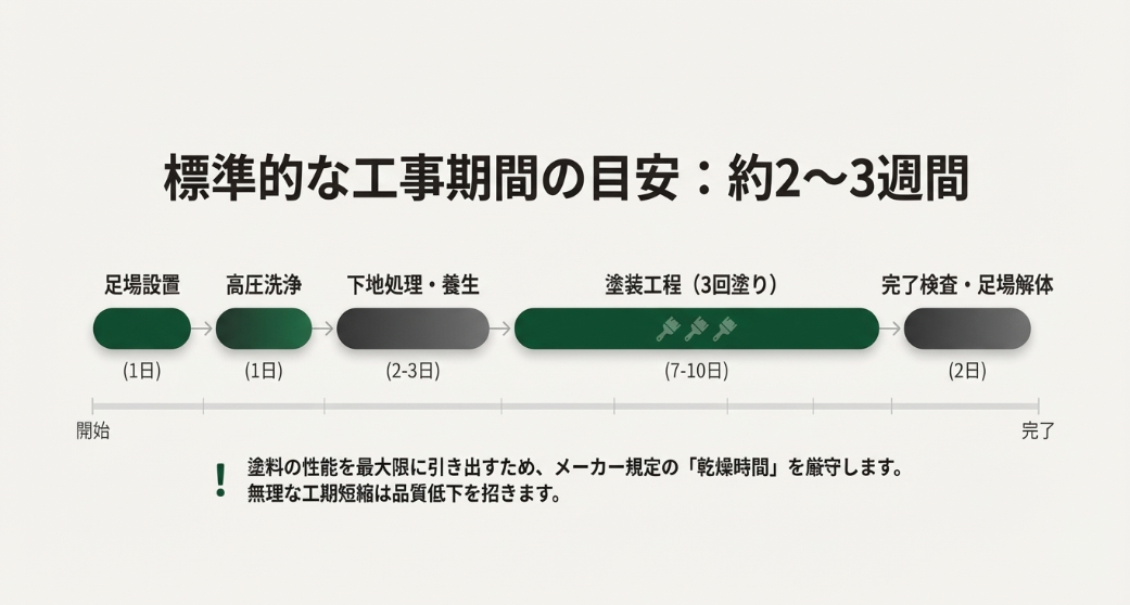 また、雨天時は塗装作業ができないため、梅雨や台風シーズンは予備日を含めた余裕のあるスケジュールが必要です。
