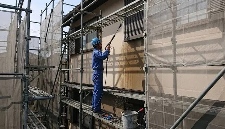 | 高圧洗浄 | 約5% | 塗装前に、外壁に付着したカビやコケ、古い塗膜などの汚れを強力な水圧で洗い流します。この作業を怠ると、新しい塗料がすぐに剥がれてしまう原因になります。 |