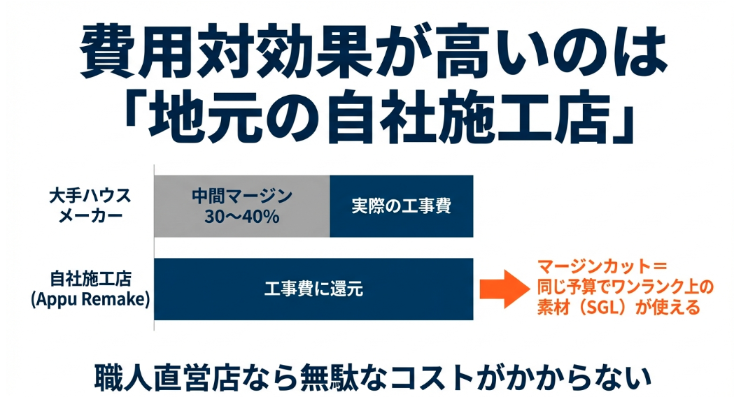 直接施工の強み:中間マージンのない自社施工店に依頼することで、同じ予算でもワンランク上の工事が可能になります。