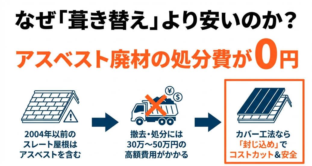 さらに、解体作業がない分、工期も短縮され、職人の人件費も削減できます。これが、築古のアスベスト含有屋根において、カバー工法が圧倒的に選ばれている経済的な理由です。