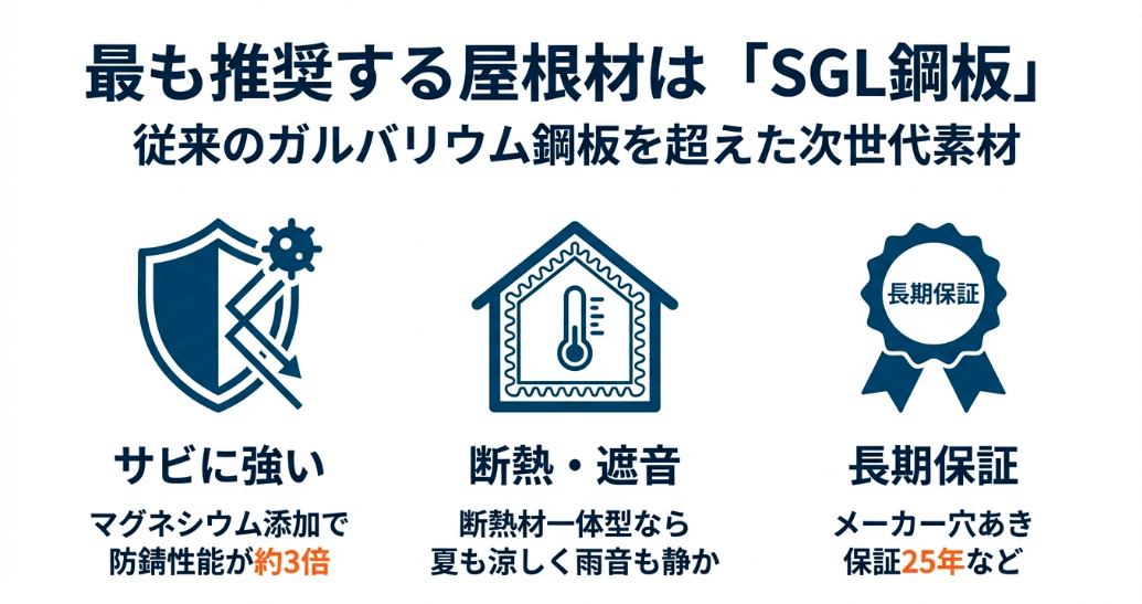 サビに強く断熱・遮音性能が高い次世代屋根材「SGL鋼板」の特徴と長期保証について