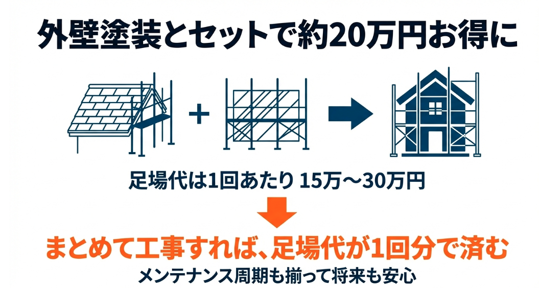 外壁塗装と屋根工事をまとめて行うことで足場代を1回分節約でき約20万円お得になる仕組み