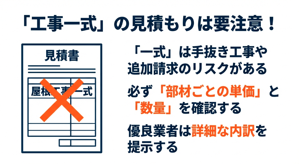 • 手抜き工事のリスク:「一式」で予算が決まっているため、見えない部分(防水シートや釘など)で安い材料を使い、利益を確保しようとする。
