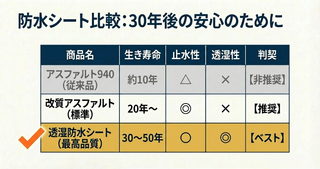 - 防水対策:最低でも「改質アスファルト」、できれば「透湿防水シート」を選定する。
