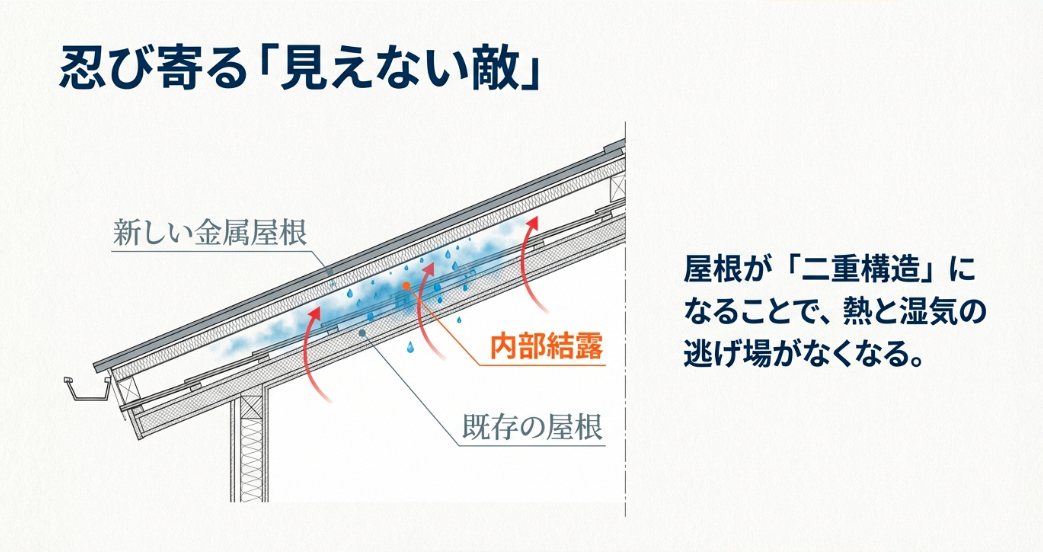 既存の屋根の上に新しい屋根を重ねるということは、建物の物理的な環境を一変させる行為です。