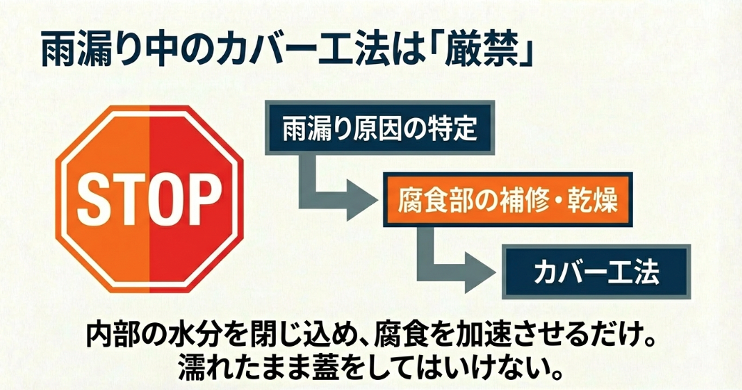 雨漏りを止めるために屋根工事を検討されるのは当然のことですが、プロとしての結論を申し上げますと、原則として雨漏りしている状態のまま、根本的な修理をせずにカバー工法を行うことは厳禁です。