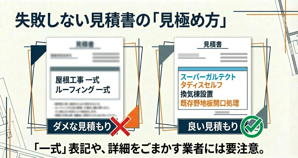 もし提示された見積書に「屋根工事 一式」「ルーフィング 一式」としか書かれていない場合は、即決を避けてください。