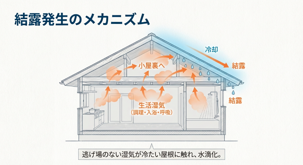 暖かく湿った空気は軽いため上昇する性質があり、天井の断熱材の隙間や壁体内を通って、最終的に屋根裏(小屋裏)へと到達します。