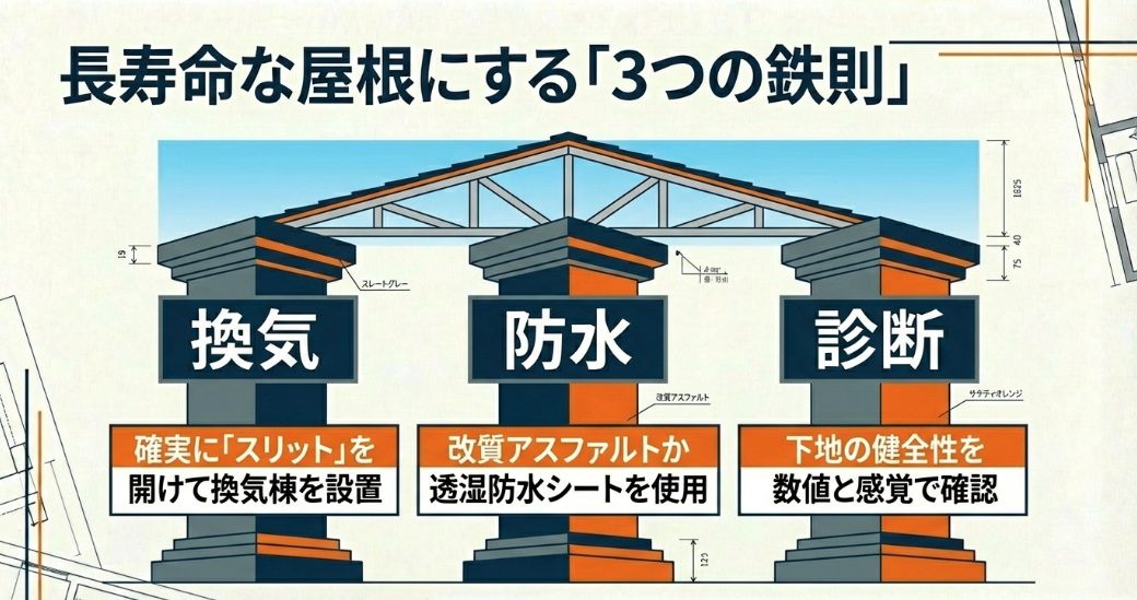 - 野地板(下地)を腐らせないために不可欠な「換気」の技術