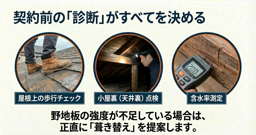 - 下地診断:雨漏りしている屋根や、強度が低下した野地板には施工しない。