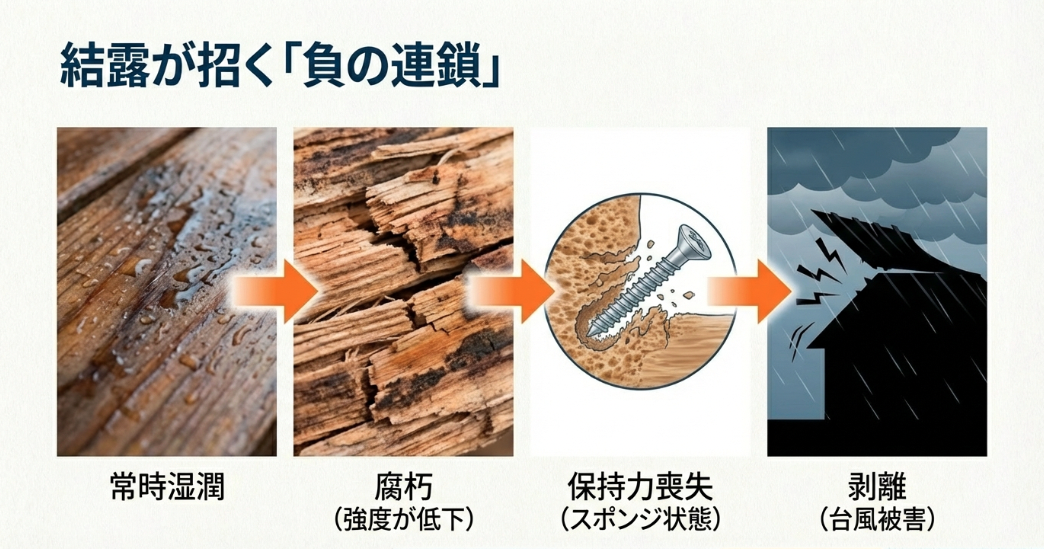 このリスクは、施工直後には現れず、数年から十年単位で静かに進行し、気づいた時には屋根の下地がボロボロになっているという恐ろしい性質を持っています。
