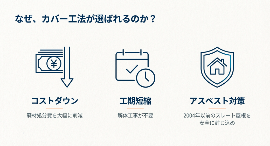 近年、既存の屋根を解体せずに新しい屋根材を被せる「屋根カバー工法(重ね葺き)」が、廃材が少なく工期も短いことから急速に普及しています。