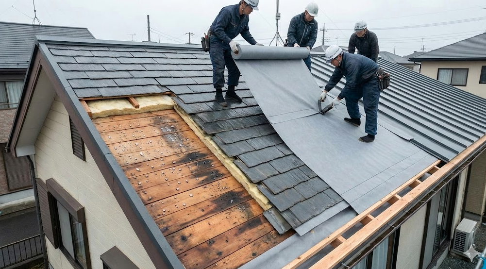 既存屋根の上に、気密性の非常に高い防水シート(ゴムアスファルトルーフィングなど)を隙間なく敷き詰め、さらにその上から金属屋根で覆います。