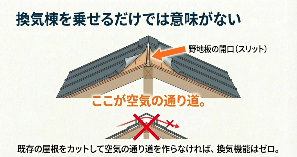 そのため、知識のない業者や手抜き業者の場合、開口処理を行わずに、既存の屋根の上にただ換気棟の形をした板金を被せているだけのケース(=飾り換気棟)が散見されます。