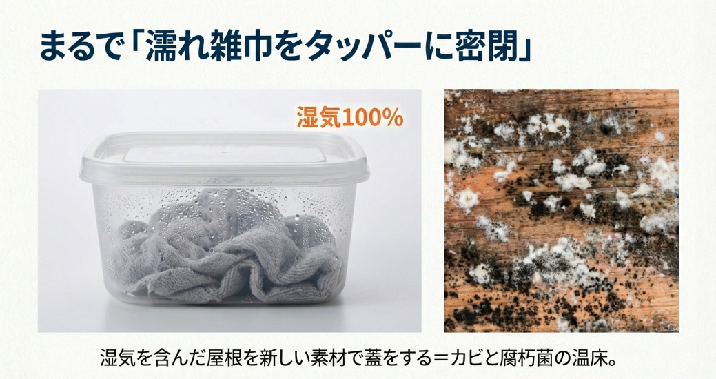 その上から新しい防水シートと屋根材で「蓋」をしてしまうとどうなるでしょうか。
